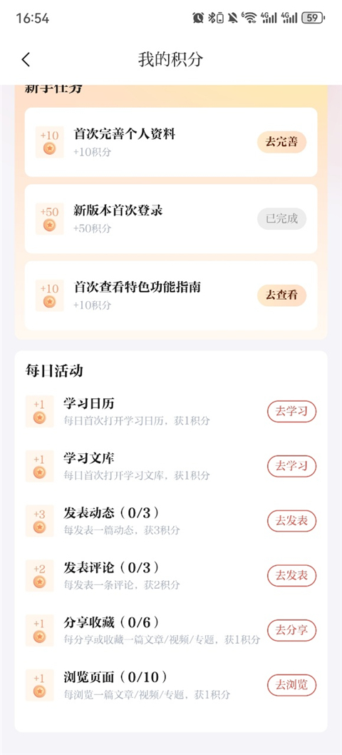 学习积分获取途径,主要有以下四类:面向下载登录5.0版本全部用户,设立12个新手任务,完成即可获得大量积分。每天打开“学习日历”“学习文库”,阅读文章、视频、专题,发表动态,评论、收藏或分享文章等,均可获得积分奖励。每周、每月连续登录更有额外惊喜。参与特别活动,邀请好友下载并登录粤学习,双方都可获得额外奖励。
