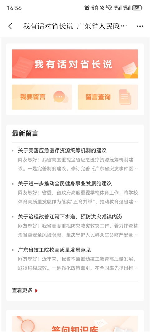 集成广东全省各地政务信息发布和政策解读,内置我要@领导、互联网+督查、辟谣平台等十多个便民应用;