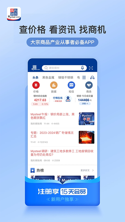 我的钢铁app是一款专注于大宗商品行情报价的服务软件,其中所涉及的产品就包含了钢铁、有色金属、炉料、化工、废钢、不锈钢、煤焦、铁矿石、农产品和能源等方面,基本上我们什么的中所用的资源都在其中。而在价格方面,软件可以说做的相当不错咯,提供了的最全面、权威、即时的大宗商品市场价格呢,这一点相信使用过该夸软件的朋友都十分的情况了。同时为了方便用户们做进一步的分析,平台还同步了三大机构(上期所、大商所、郑商所)数据哦,行情、资讯、分析报告应有尽有相当的贴心。