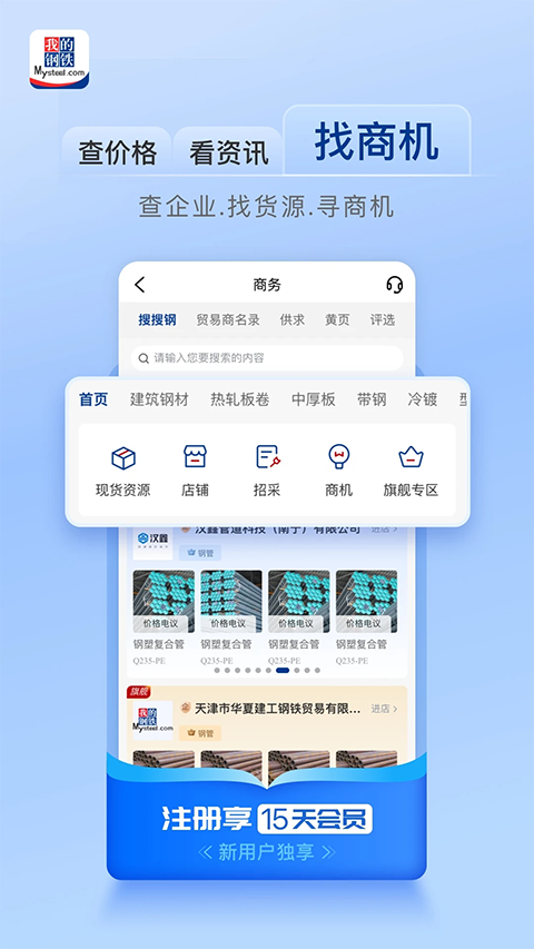 即时短信:丰富信息一键定制,市场行情、钢厂调价、调查&库存统计等信息即时推送,商机与您不期而遇;