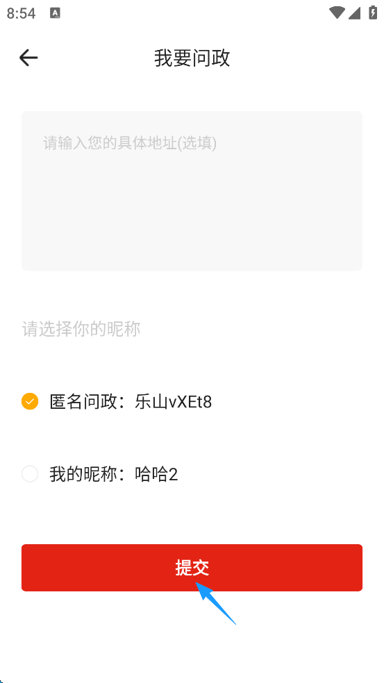 5、选择性填写“自己的具体地址”,随后点击屏幕下方的“提交”。