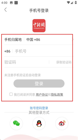 3、在手机号登录页面,填写信息并勾选协议后,点击登录完成账号登录。