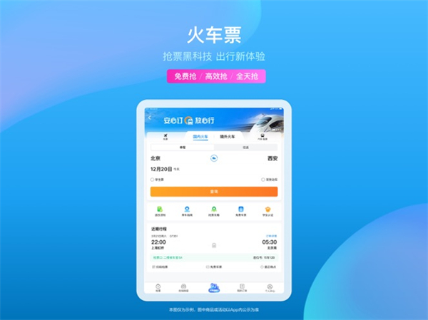 - 火车票:支持国内、国际火车票预订。集抢票、学生票预订、12306直连于一体,甚至还可以享受足不出户送票上门的贴心服务。