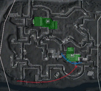 作为进攻方,如图,最显然的例子就是单点区域的进攻,以临界点A区为例,区域内一旦被肃清,防守方复活点受挤压后移,便只能通过劣势地形沿红色箭头进行回防反清。此时,通过对场上占领读条的观察,指挥官便可以在读条最后一刻,确保万无一失地下一个高价值目标命令,在极短时间内稳稳吃下一波高价值分数奖励。这便是一种“合适的”高价值目标标记。