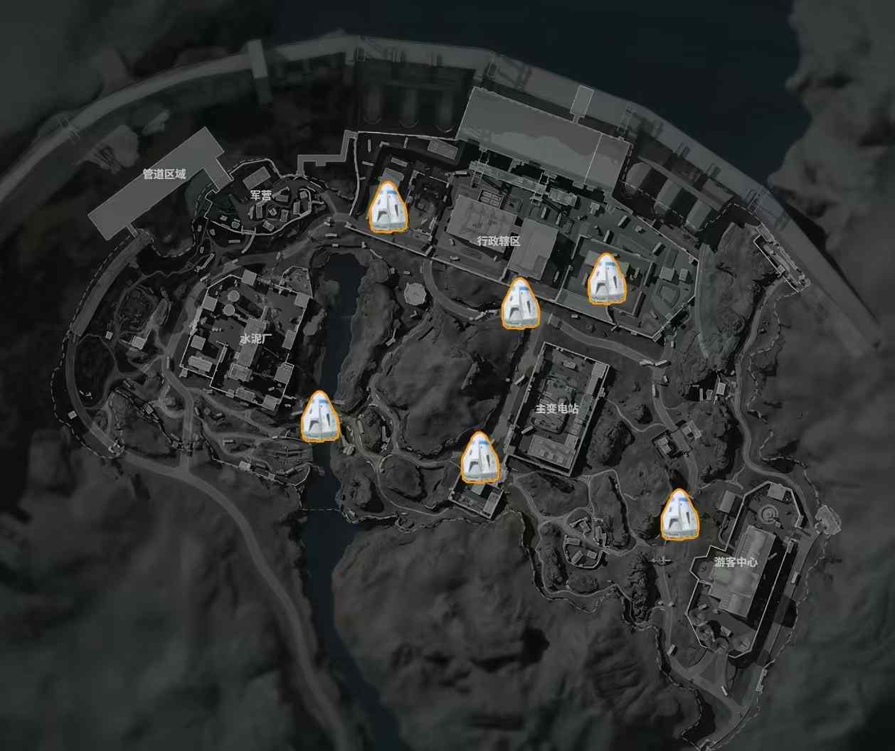 零号大坝这张图中空投的降落点位一共有六个,三个在行政楼区域,另外三个点位分别在水泥厂西面桥附近、小变电站左上角以及游客中心左边的公路上。