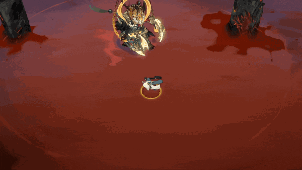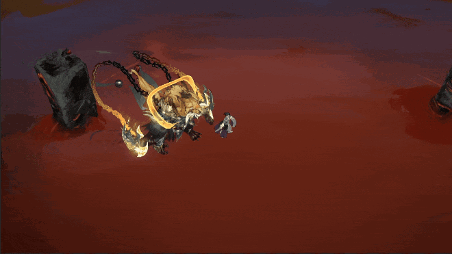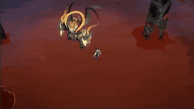 机制解析:金猊君会将斧头插在地上拖动,并向玩家发起冲锋,对撞到的玩家造成伤害,同时停下对身前的玩家造成一次额外伤害。