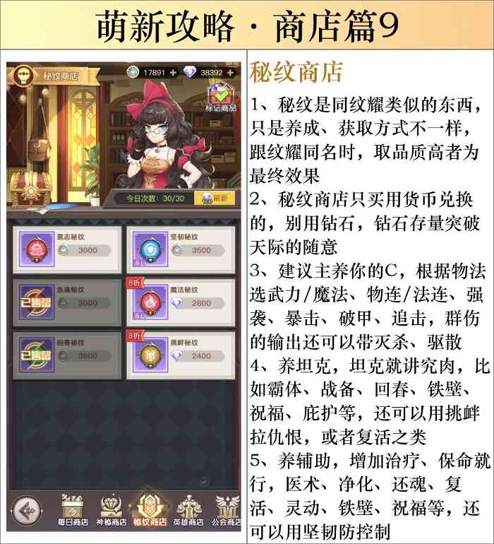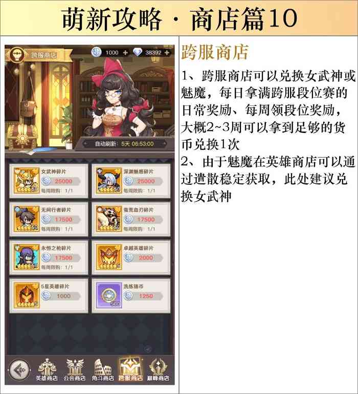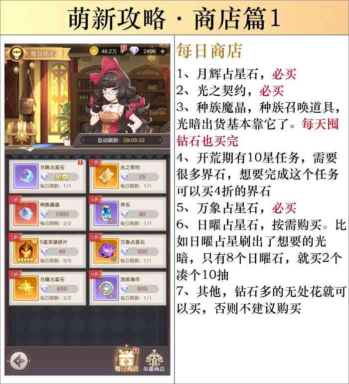 ①魔晶尽量别买每日商店里的,尽量在神秘商店和无尽之海杂货小铺买更便宜的(魔晶就白嫖为主就行概率这玩意很拿不准神秘商店和海域里的够用)。还有日耀最好是抽海拉,女武神,木枪这几个,如果不是这个几个角色别碰(如果运气好这里拿到了一个木枪,抽奖又拿到一个,活动又拿到一个就能升到9星了,前期直接横着走)