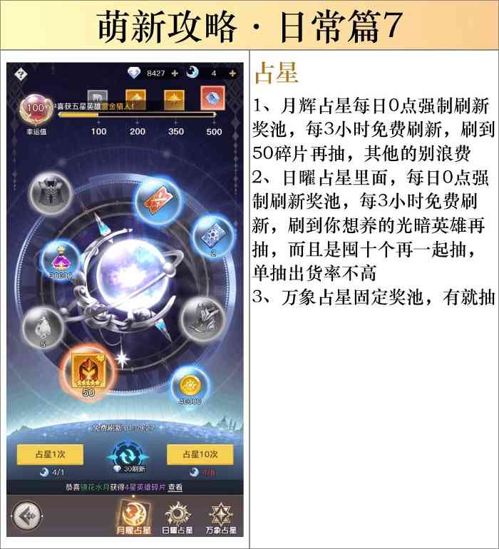 然后是占卜之类的月辉和日耀都建议先存着,等刷新出好的再抽,日耀建议屯个十抽再抽这个能出就出不必屯4.50抽,其中还有种族魔晶和红装备别浪费了,有时候几十抽也不出就很无语