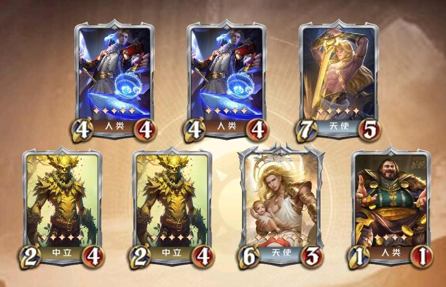 双树人(4,5号位)加大富翁(7号位)保证经济,利用人类的曙光统领(1,2号位)给天使刷属性,曙光圣女(未在图片中展出)大量加攻击力。注意不要让炽天使(6号位)血量成为最低。这个阵容也可以用来养精灵的弓箭手和亡灵的赴死之刃。