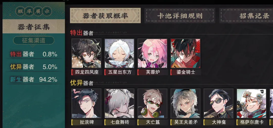 器者招募这个每天慢慢攒人品的环节中,0.8%的概率出红色器者,其中1/4的概率是四龙四凤,所以理论上只要大家玩的够久,四龙四凤都是可以随到的,不过在眼下就算是这个照面随到了四龙四凤,其实意义也不大了,因为后期的四龙四凤真心是比较乏力的,那么为什么他会出现这种后劲不足的尴尬情况呢?主要原因有如下几条: