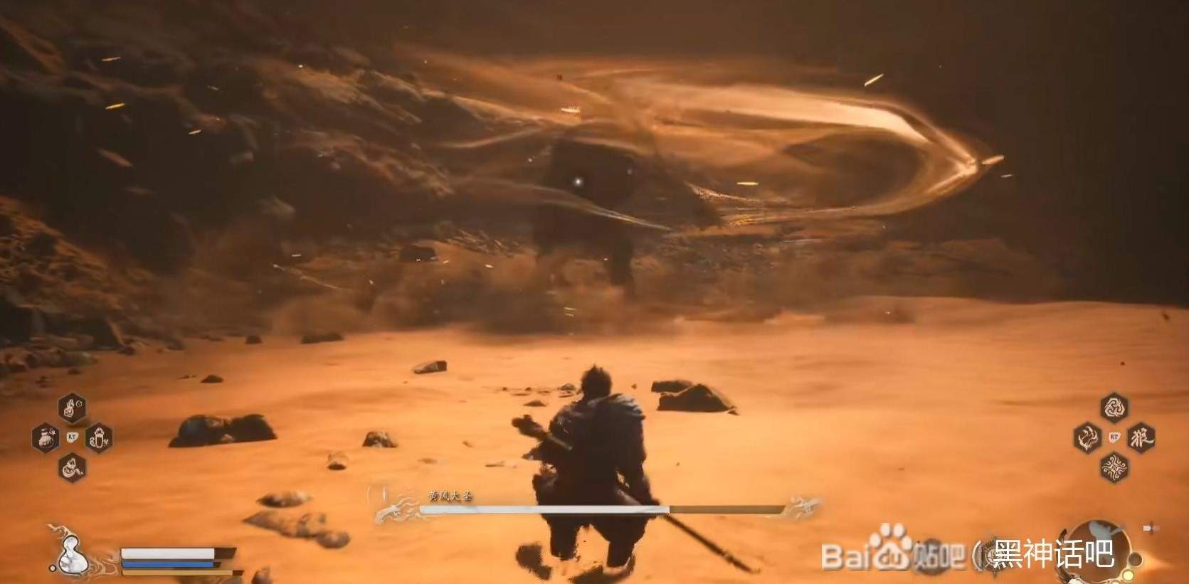 首先我们在遇到灵吉变身的无头人后,我们就可以学到身外身法了。由于我们之前打过了黄风岭的虎先锋和其他的妖王,我们就可以打开旁边的那一扇门。直接往右边行走,再直线前行,会看到一阵龙卷风,那里面就是黄风大圣的所在处,我们进去后,触发过场动画,结束完后就开始直接对打。
