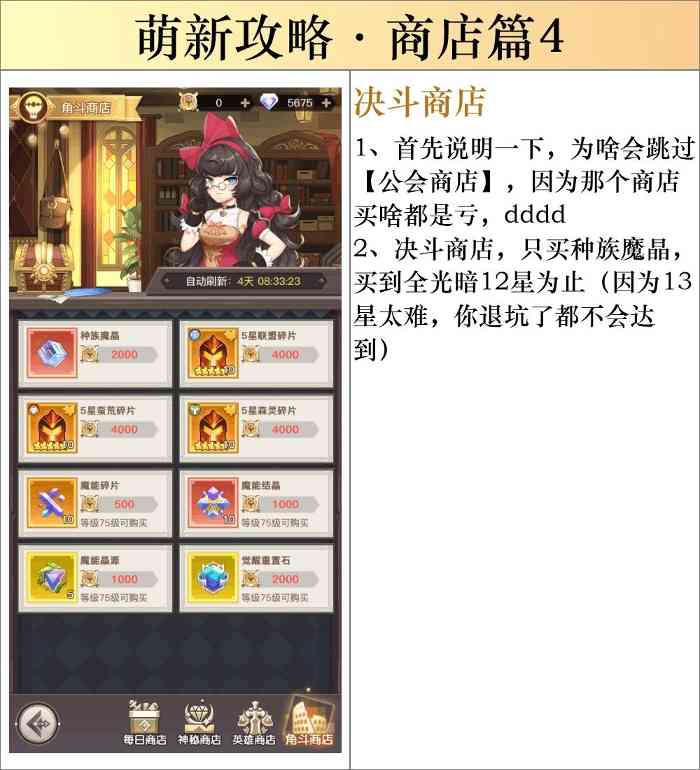 ①魔晶尽量别买每日商店里的,尽量在神秘商店和无尽之海杂货小铺买更便宜的(魔晶就白嫖为主就行概率这玩意很拿不准神秘商店和海域里的够用)。还有日耀最好是抽海拉,女武神,木枪这几个,如果不是这个几个角色别碰(如果运气好这里拿到了一个木枪,抽奖又拿到一个,活动又拿到一个就能升到9星了,前期直接横着走)