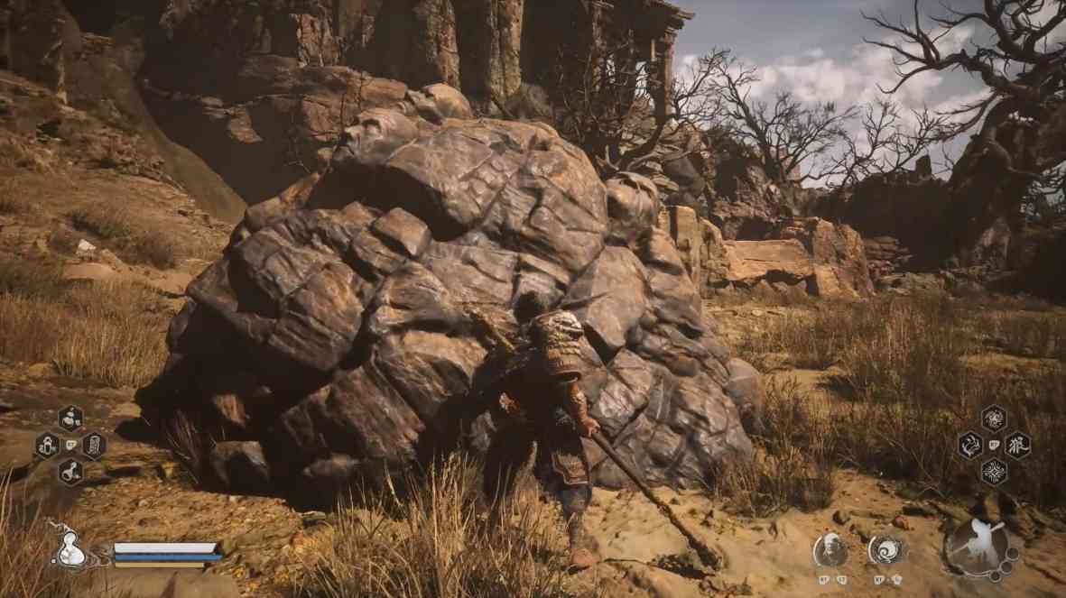 收集完六颗眼珠后,一样来到挟魂崖的枕石坪,往土地庙的左前方走,对着石堆互动,就能召唤石敢当了,另外这里也是石先锋的妖王房,如果还没打的话,可以引诱他们靠近,就能看到石敢当和石先锋打架的画面哦。